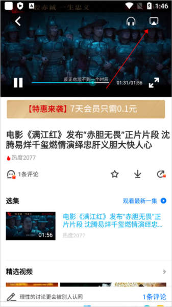 3. 满足条件后,在手机视频播放页点击右上角投屏图标即可。