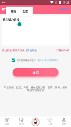 离线下载:通过输入磁力链接或上传BT文件即可创建离线任务;