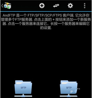 1. 打开AndFTP应用,界面如图所示,点击上方的加号+,添加你的域名,选择类型(例如sftp),输入账号与密码,其他设置可暂不修改,然后点击高级选项。
