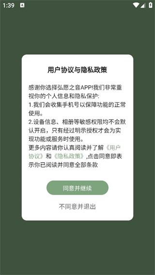 1、下载安装弘愿之音app,打开后点击同意并继续,即可进入佛音环绕的世界。