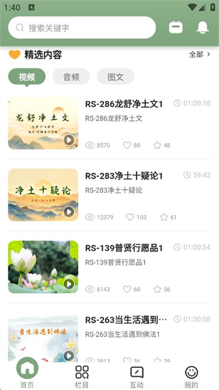 2、首页展示大量佛法音频与视频资源,用户可挑选感兴趣的内容聆听观看。
