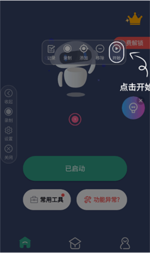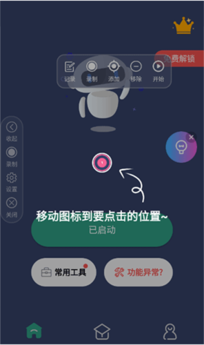 1、通过浮动控制面板启动或结束自动点击,可在屏幕上添加并保存点击位置;