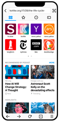 1、简洁的主屏幕设计:从上次中断的地方继续浏览。直观地管理所有已打开的标签页,并快速访问近期书签、常用网站以及Pocket推荐的热门内容。