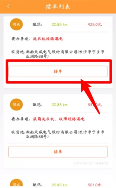 1、点击首页“接单”按钮可查看附近订单,按下“接单”即可抢单。
