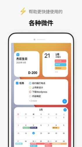 - 包含日程、任务、备忘、笔记及日历等多种模块;