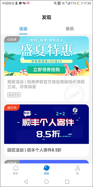4、发现页面汇集了园区周边各类商业优惠与活动信息。