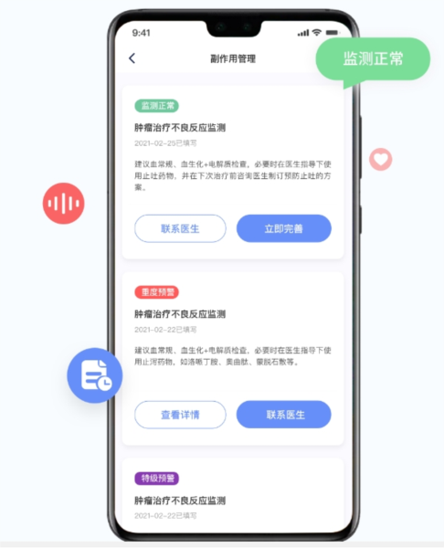 副作用管理:定期记录治疗期间的身体指标变化,协助监测院外不良反应,系统对异常指标自动预警,及时提醒医生干预。