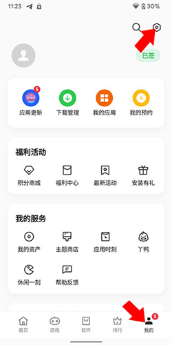 1、在软件商店首页右下角点击“我的”,进入个人页面后,点击右上角的设置图标;