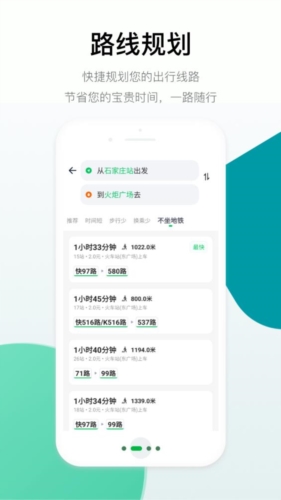 5、线路换乘: 输入起点与终点,应用将快速提供多种可行的公交换乘方案。