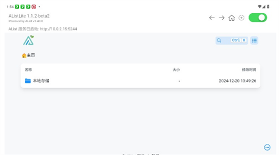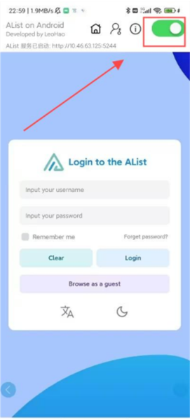 2、启动alistlite服务后,建议在电脑上访问显示的服务地址进行后续配置。在应用界面点击右上角开关可启停服务;服务成功启动后会显示前端页面及当前绑定的IP与端口信息。