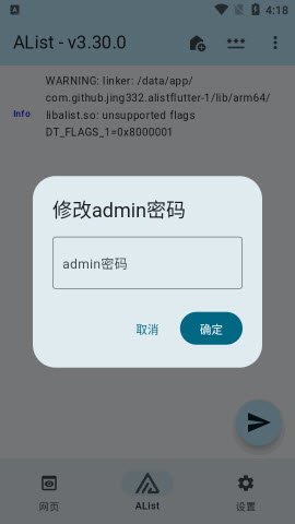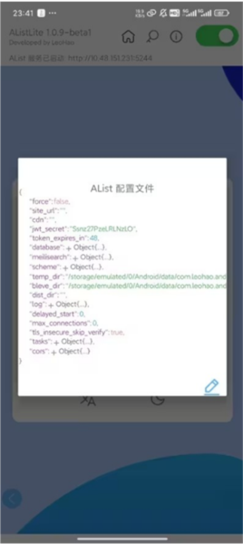 5、注意:不当的配置可能导致服务无法启动,修改时需谨慎。用户可手动修改AList配置文件,路径为/Android/data/com.leohao.android.alistlite/files/data/config.;在版本信息页面下方可找到高级配置入口进行修改。