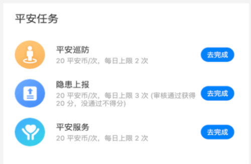 3、积分激励,增强归属感:完成任务可赚取平安币,用户既可展示于巡防排行榜,也能兑换实用奖品,持续调动参与积极性。