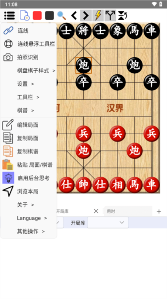 (主菜单第二项可调出悬浮工具栏;若使用悬浮模式,请确保不遮挡被连线棋盘的棋子)。