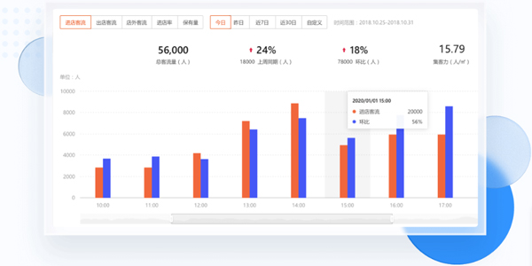 实时客流查看:通过精准计数,统计各时段进出客流量,实时掌控门店人流;