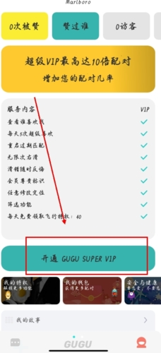 2、向下滑动找到并点击【开通 GUGU SUPER VIP】选项。