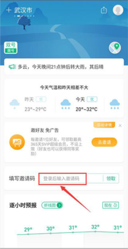 2. 在逐小时预报上方找到邀请码填写入口,需登录后操作。
