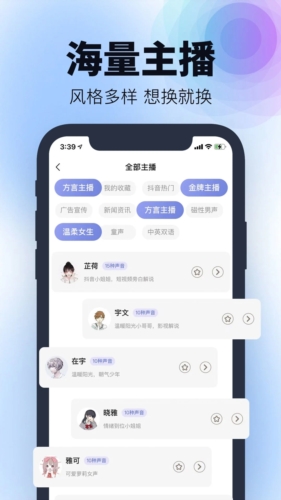 1、声音资源丰富:提供近三百种优质主播音色,风格覆盖广泛,用户可自由切换选用;