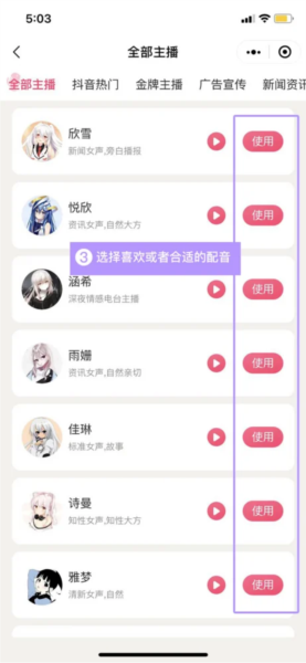3、从声音库中挑选符合需求的主播音色。