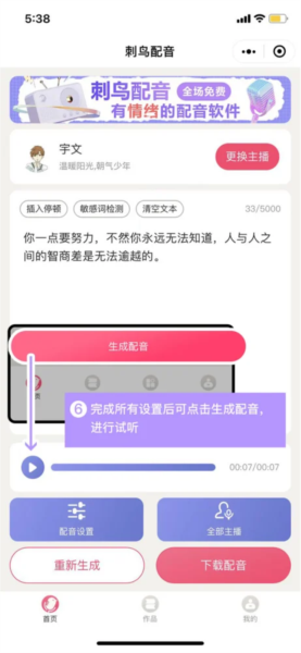5、完成所有配置后,点击生成配音按钮,对合成结果进行试听预览。