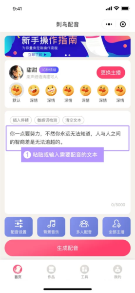 刺鸟配音应用由长沙后浪网络科技有限公司研发,是一款高效便捷的文字转语音工具。该软件能够帮助用户将输入的文字内容快速合成为自然流畅的语音,适用于日常工作与生活中的多种音频制作需求。软件内提供了丰富多样的音色选择,并配备多种实用编辑功能,方便用户对生成的配音进行细致调整,从而获得满意的音频成果。