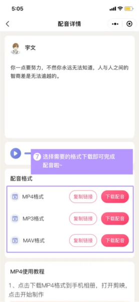 6、试听满意后,选择所需音频格式进行下载,即可完成整个配音流程。