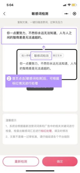 2、在首页使用敏感词检测功能,系统会将可能存在问题词汇标红提示,用户可据此修改。