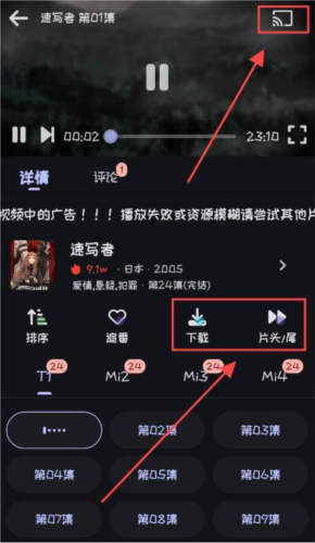 3、播放界面右上角设有投屏按钮,下方提供下载及跳过片头片尾等功能设置。
