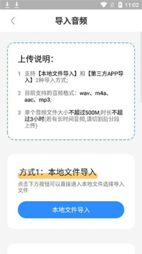 5、点击右上角图标可导入音频,提供本地导入与第三方应用导入两种方式。