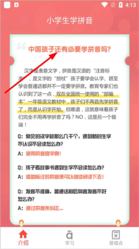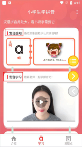 1、启动小学生学拼音应用,首页可见介绍、学习和易错点三大板块,介绍部分主要讲解汉语拼音学习的基本信息;