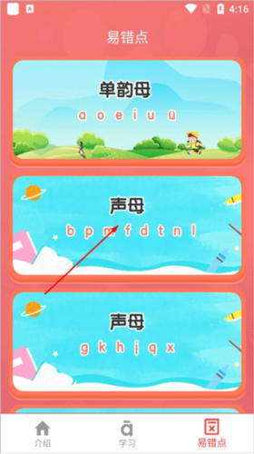 3、易错点板块归纳了单韵母、声母、复韵母及拼音笔顺等常见难点,可按类别选择学习;