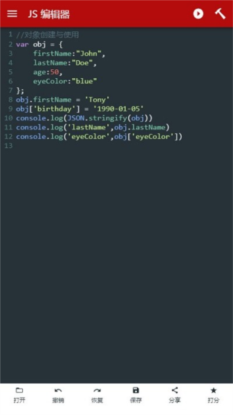 这是一款离线的JavaScript编辑器,支持代码编写、运行、调试、本地保存与读取JS文件;