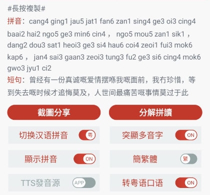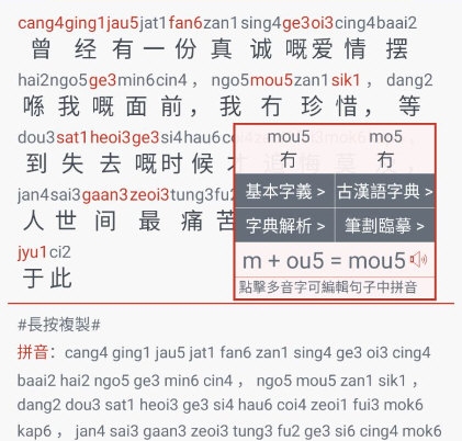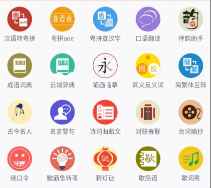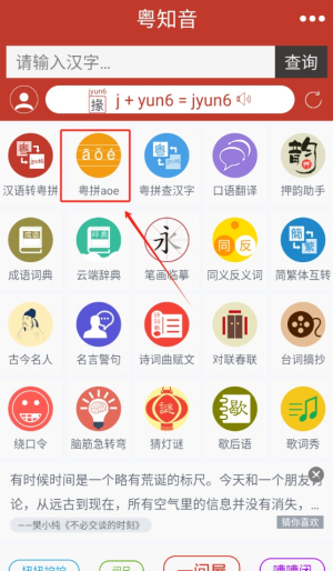 5、词典功能:内置辞典、成语词典及古汉语常用字字典,内容均标注粤拼,可随时点击查询。