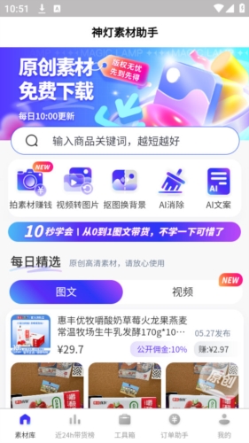 2、素材搜索:输入商品关键词,查找相关的素材内容。