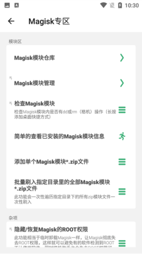 2、进入功能区的Magisk专区,查看详细功能列表;