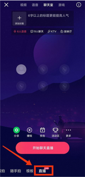 4、返回主界面,点击底部的【+】按钮,将选项滑动至【直播】标签页,即可开始直播。