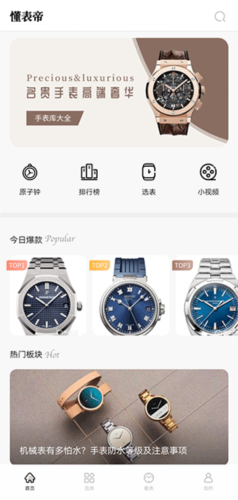 1、打开懂表帝应用,首页可查看原子钟、手表排行榜、选表专区及各类腕表短视频。