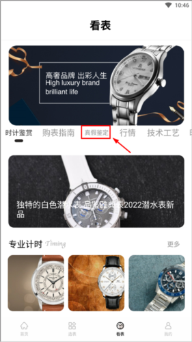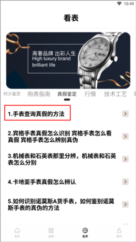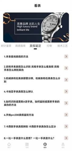 3、在看表板块,用户可以学习鉴赏技巧、购表指南、真假鉴定、市场行情及工艺技术等专业知识。