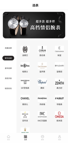 2、进入选表界面,可按品牌、价位等条件筛选,浏览不同类别的手表。