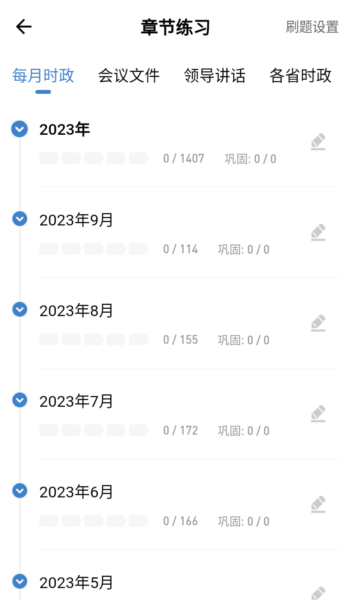 1、安装应用后打开,点击“时政试题”可免费使用每月时政、会议文件、领导讲话三大板块的章节练习。