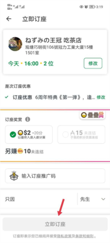 4、选定具体时间与人数等信息,点击立即订座完成操作。