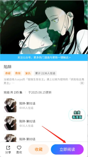 5、点开想看的漫画进入详情页,点击立即阅读按钮。