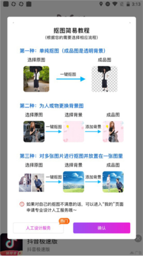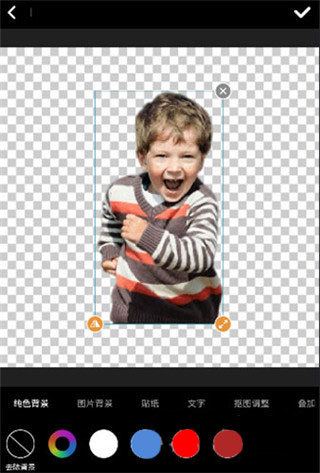 4、在编辑界面可更换背景、添加贴纸文字、调整抠图位置与叠加效果,编辑完成后点击确认并保存。