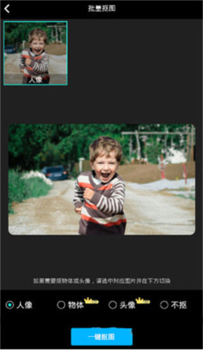 2、根据主体类型选择人像、物体或头像选项,点击“一键抠图”。