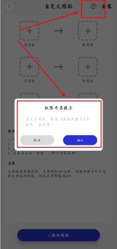 3、首先点击右上角安装按钮左侧的【?】,依照指引开启创建桌面快捷方式的必要权限;