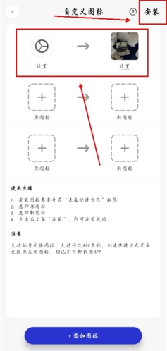 4、随后选择需要替换图标的应用程序,上传自定义图片,点击安装即可完成。