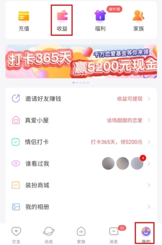1、在“我的”页面点击进入收益中心;