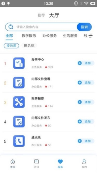 新办事大厅汇集了校内师生常用的各类信息化应用与资源,包括各种办事流程和业务系统。用户可按自身需要快速找到对应服务。新版页面还支持搜索功能,用户可通过搜索栏迅速查找目标服务。