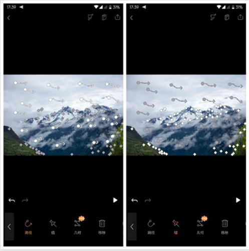 原图中云雾与天空是静止的;为营造“云雾缭绕”的流动感,可使用动画功能中的路径工具,设定云雾飘动的方向,并用锚点功能固定住不应移动的山体与树木。