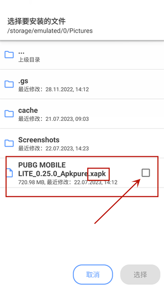 4、进入文件选择界面,可以搜索或直接点击目标文件;例如找到一个后缀为xapk的安装包。