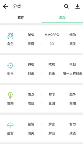 2、分类页面提供了极为详细的软件与游戏分类,包括大类与小类,方便用户按需查找。
